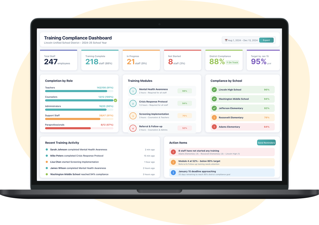 Prepare your district for successful mental health initiatives. Assess gaps, build policies, train staff, and create a sustainable infrastructure before you screen your students.